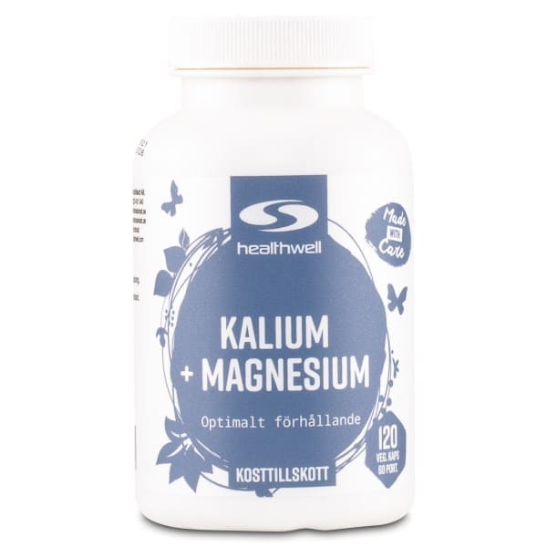 Healthwell Kalium+Magnesium er det ultimative kombinationstilskud, både med mineralerne kalium og magnesium. Kalium og magnesium har begge lignende funktioner i kroppen, og hjælper med at opretholde et normalt nervesystem, muskelfunktion, blodtryk og mindske træthed og udmattelse. Kapslerne er helt vegetabilske og nemme at sluge, men de kan også deles ved behov, for dem, som gerne vil undgå at sluge hele kapsler. En dosis indeholder 300 mg elementært kalium og 240 mg elementært magnesium. Den anbefalede dosering er to kapsler dagligt.