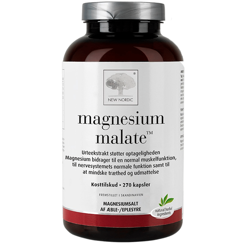 New Nordic Magnesium Malate kombinerer magnesiummalat, B6, B12, D3 og planteekstrakter for energi, muskelfunktion og velvære. 270 kapsler til 3 måneder.